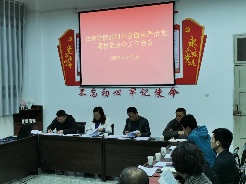 3月31日下午,体育公司在体育馆一楼会议室召开2021年全面从严治党暨稳定安全工作会议。sunbet申搏全体教职工参加会议,会议由党总支书记高立平主持。