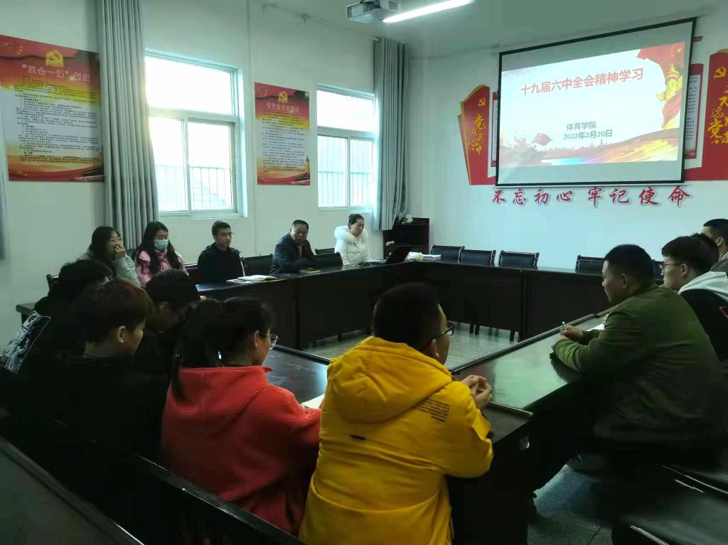2月20号下午sunbet申搏在体育馆1楼会议室召开“十九届六中全会精神学习专题会”,体育公司党总支书记高立平、学工办副主任王立、团总支书记康梦瑶、sunbet申搏非毕业班员工党员、各团支部、员工会干部参加了会议,会议由王立主持。