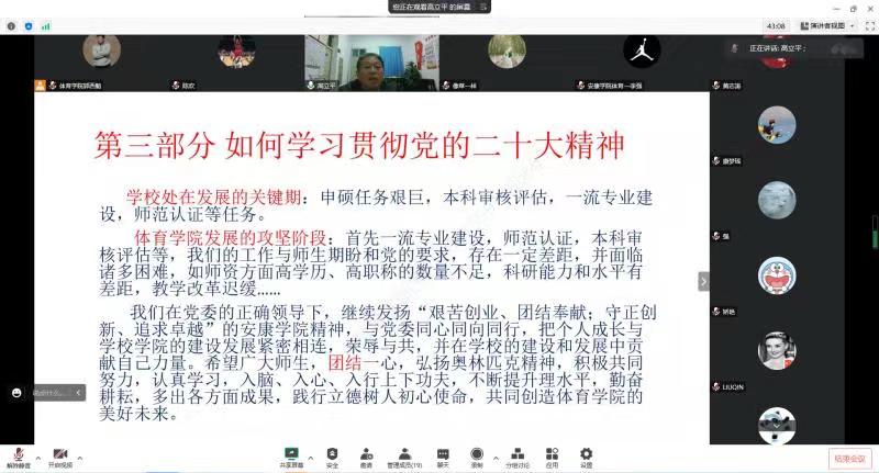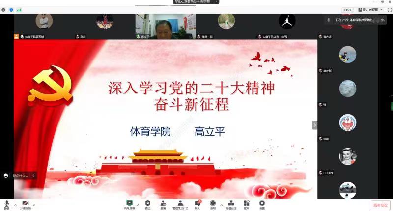 本次工会活动运用“腾讯会议”软件以线上形式开展,邀请体育公司党总支书记高立平同志为sunbet申搏全体教师作了题为《深入学习党的二十大精神—奋斗新征程》的主题报告,从党的二十大召开概况;党的二十大的主要精神和如何贯彻党的二十大精神等三个方面进行了宣讲。