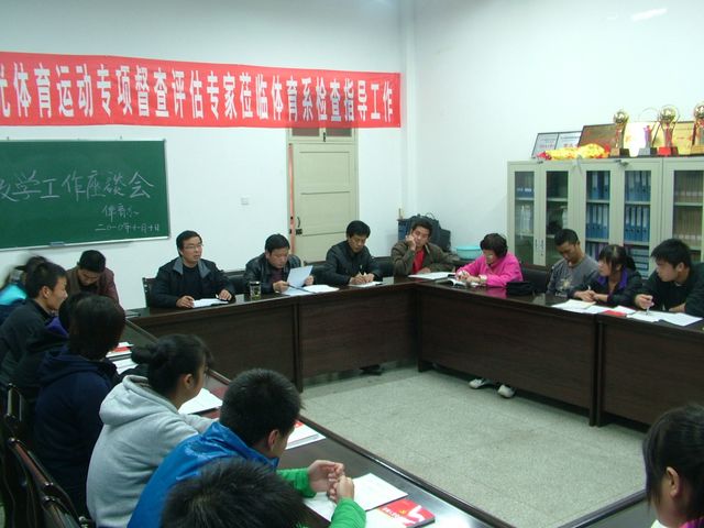 11月11日晚7:30,体育系召开了普通专业员工教学工作座谈会,副主任鲁宗成、公共体育教研室主任吕仙利、教学秘书易红君和2009级普通专业本科班体育委员17人参加了会议。