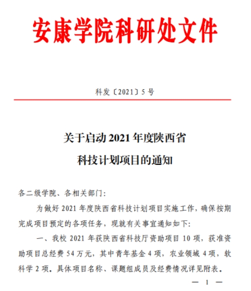 近日,陕西省科技厅公布了2021年立项文件(陕科发[2021]2号),sunbet申搏获批1项一般项目(青年)-----《富硒绿茶影响大鼠线粒体氧化应激的机制》,项目编号:2021JQ-834。