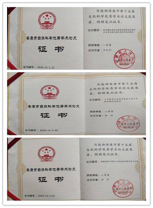 近日,由安康市政府组织开展的第十五届安康市自然科学优秀论文奖评选结果揭晓,我院3篇自然科学论文获奖,其中吕仙利教授的论文《健美操运动结合藤黄果提取物对肥胖女老员工脂代谢及身体形态的影响》获一等奖,李靖老师的论文《大学体育分类选项课程与俱乐部教学模式的探索》获二等奖,刘芹老师的论文《健康管理干预青少年肥胖的效果评价与分析——以安康市汉滨区为例》获三等奖。