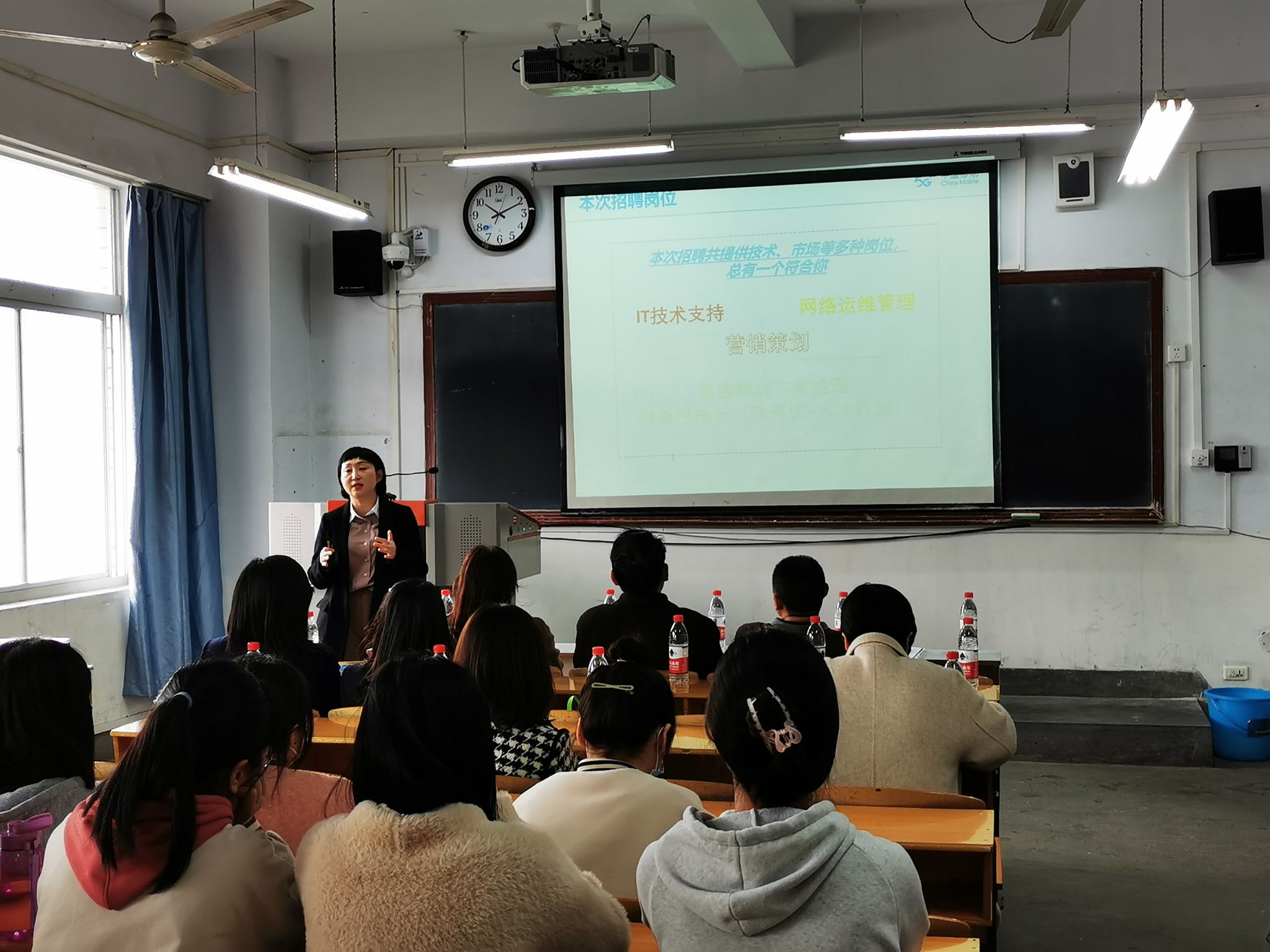 为了贯彻落实党中央国务院关于做好毕业生就业工作的要求,进一步拓宽毕业生就业渠道,促进公司2023届毕业生就业工作,3月17日早上9:30在1516教室,在公司招就处的指导下,公司和数统公司联合举办23届毕业生就业专场招聘会。招就处副处长程国栋、数统公司党总支书记郭全寿、体育公司党总支书记高立平、领军教育安康负责人冯云、领军懂得体育大市场负责人贾妮、安康移动人力资源部经理姜琼、安康移动招聘主管陈静及公司19级毕业生、20级在校生、数统公司员工参加。活动由康梦瑶主持。