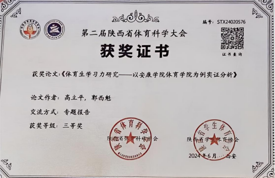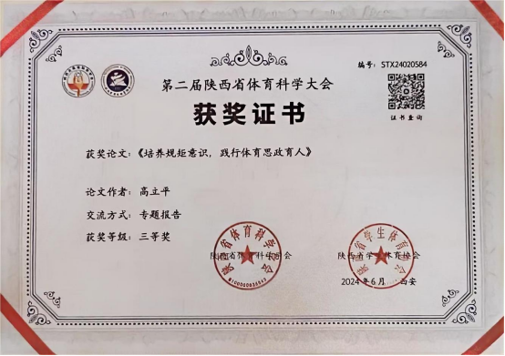 6月22日,第二届陕西省体育科学大会在陕西师范大学长安校区举行。公司教师高立平参加了本届论文报告会,并在论文报告会做了专题报告。高立平和郭西魁合作撰写的论文《体育生学习力研究—一以sunbet申搏为例实证分析》和高立平撰写的论文《培养规矩意识,践行体育思政育人》均获得三等奖,并被第二届陕西体育科学大会正式录用。