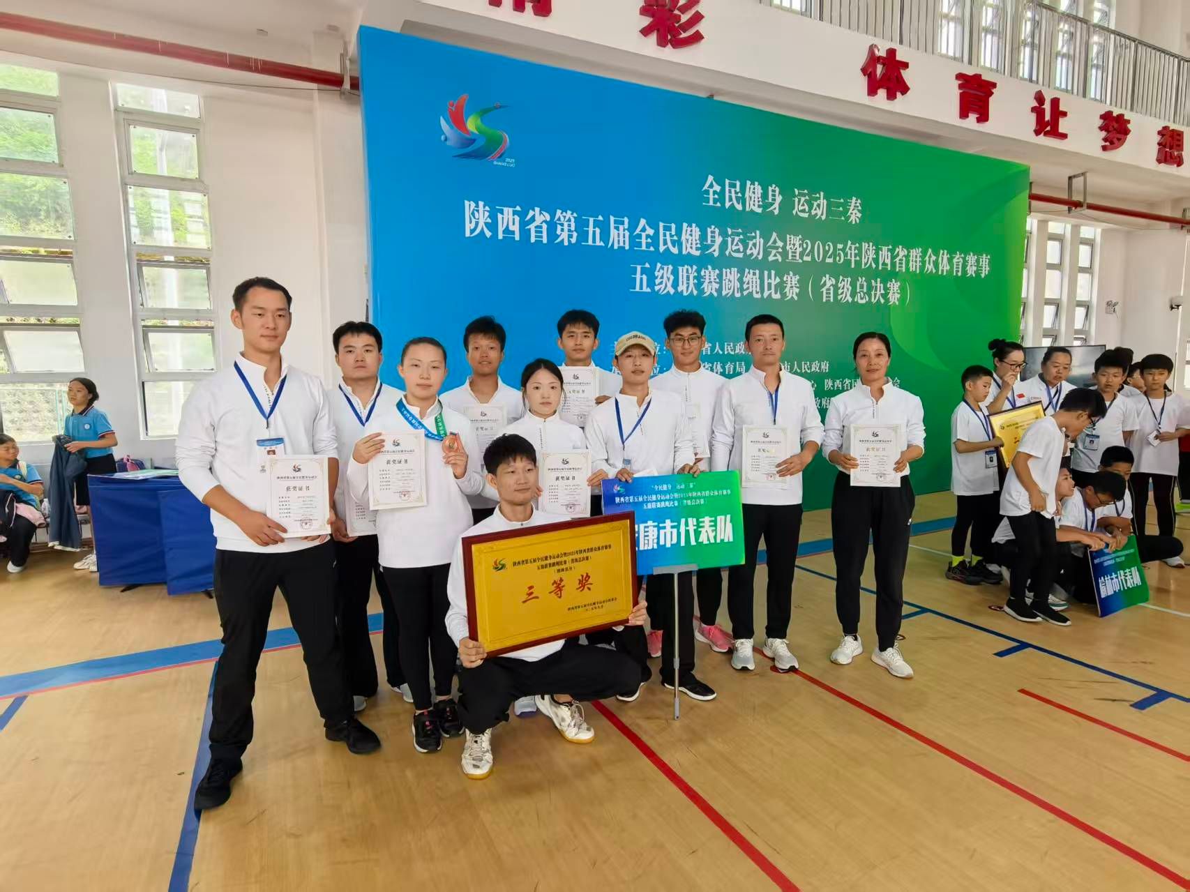 9月27日下午,由陕西省人民政府主办的陕西省第五届全民健身运动会暨2025年陕西省群众体育赛事五级联赛跳绳比赛(省级总决赛)在商洛市柞水县圆满落幕。公司跳绳队首次代表安康市征战该项省级赛事,便在与包括国家跳绳队在内的强劲对手同场竞技中脱颖而出,荣获团体三等奖和多个单项奖项,为校争光、为安康添彩!
