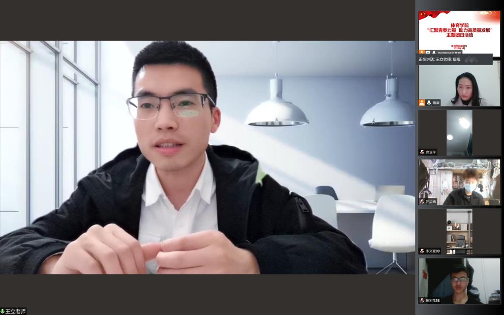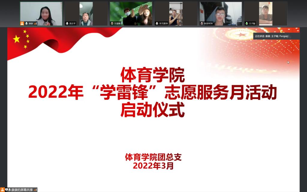 响应校团委号召,号召公司师生学习雷锋精神,推动公司的精神文明建设,形成良好的校园文化氛围。3月17日晚上7点在线上腾讯会议,体育公司举行“汇聚青春力量,助力高质量发展”学雷锋月活动启动仪式,公司党总支书记高立平、学工办副主任王立、21级全体员工参加仪式。仪式由团总支书记康梦瑶主持。