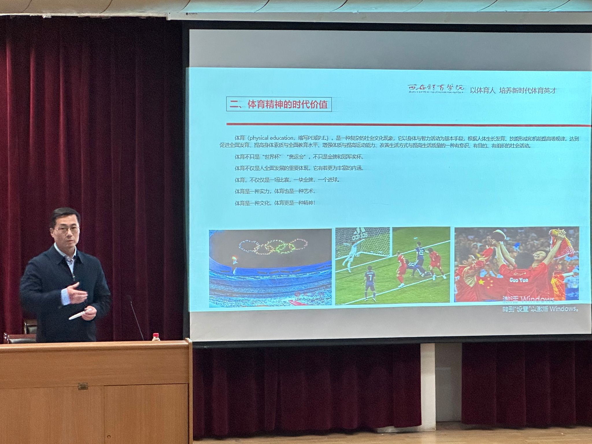 高教授首先解读了党和国家对体育工作的指导思想,精辟地论述了德、智、体辨证关系,阐述了体育“强筋骨、增知识、调感情、强意志”的四大作用;其次,对“为国争光、健康第一、永不言弃、规则意识、公平公正、体育育人”等体育精神的时代价值进行了系统讲解;最后,强调了体育院系是传承体育精神的重要阵地,承担着“以体育人--------培养新时代体育英才”的重要任务。在“体育强国”和“一带一路”背景下,机遇与挑战并存,体育工作者应肩负使命,积极适应基础教育的变化、深化校企合作,开展访企拓岗专项行动,拓宽就业渠道。不断强化员工就业内动力,为党和国家输送更多的体育英才。